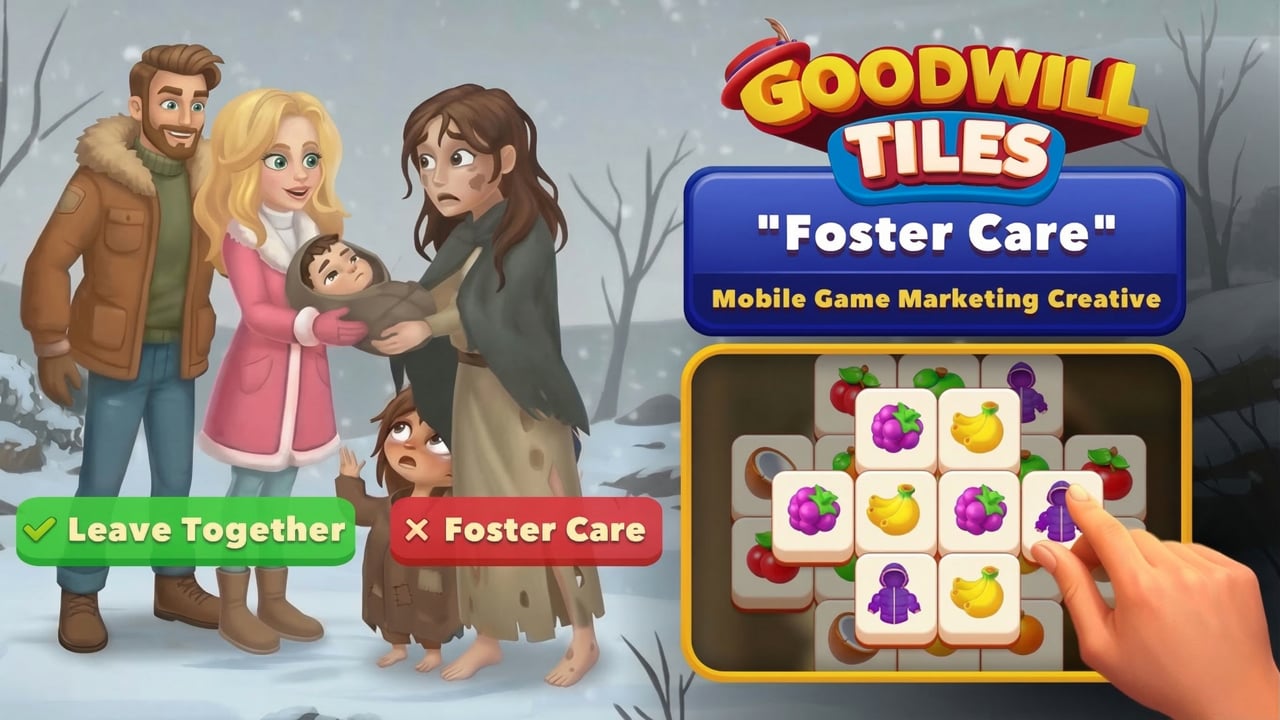 This video is a marketing creative concept for the mobile puzzle game idea "Goodwill Tiles". The ad begins with an emotional winter scene where a struggling mother faces a heartbreaking decision during a cold snowy day. She is about to give her child to a wealthy family for foster care, highlighting the difficult reality of poverty and survival. At this moment the viewer is presented with a choice: "Foster Care" or "Leave Together". Choosing "Leave Together" transitions into gameplay where the p